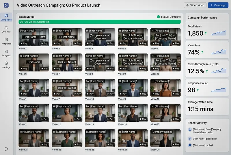 A personalized video message gets dramatically more replies than a text email. HeyGen's video personalization takes one recorded message and swaps in each prospect's name, company, and a custom opening line — making every video feel 1:1 at massive scale.